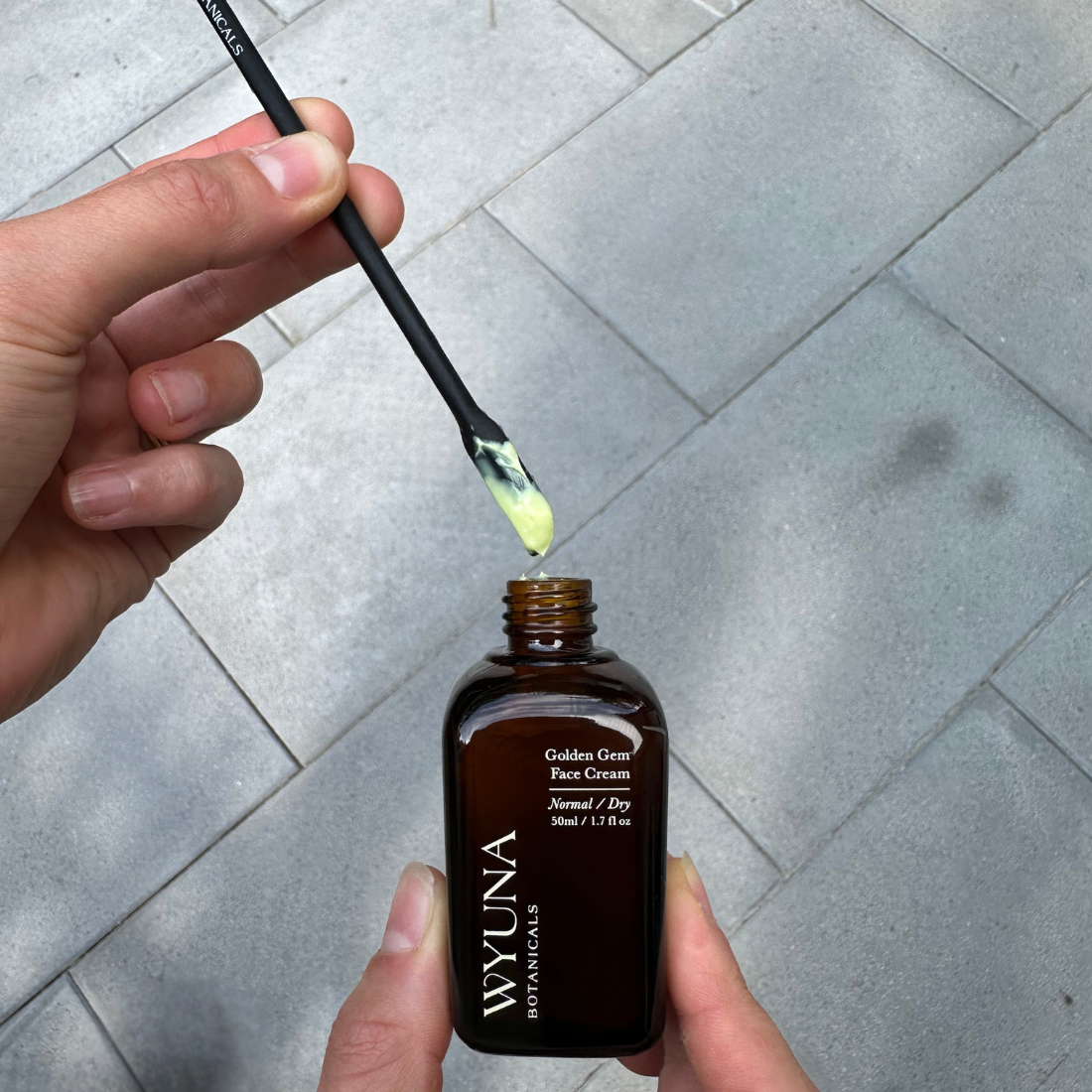 The Wyuna Spatula allows you to easily scoop and retrieve every last drop of our Golden Gem Face Cream.